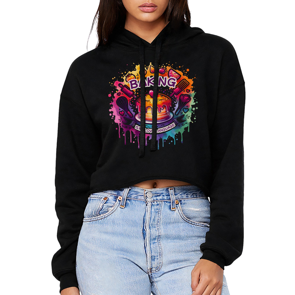 Baking Is My Love Language Women’s Cropped Hoodie – Kitchen Chef Hooded Sweatshirt – Colorful Graphic Super Crop Top Hoodies