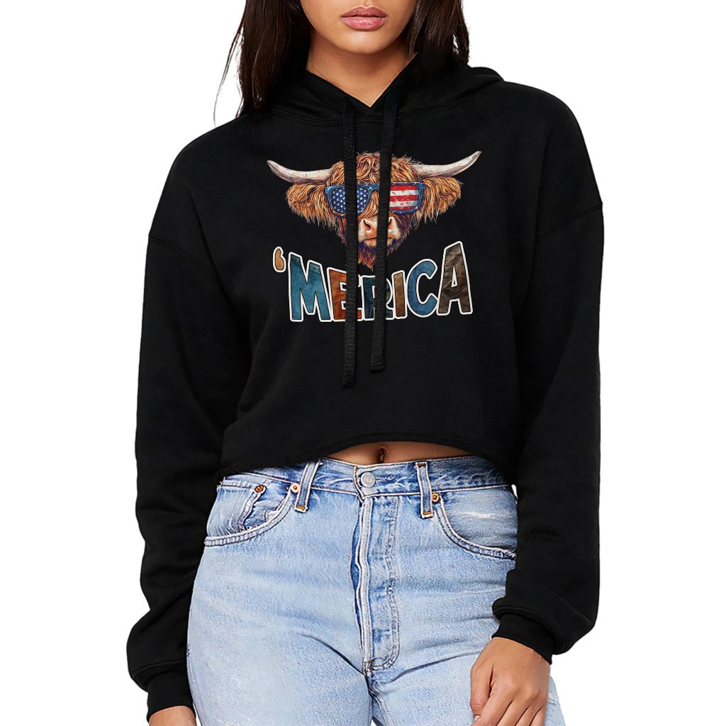 Highland Cow Women’s Cropped Hoodie – Merica Hooded Sweatshirt – Cool Design Super Crop Top Hoodies