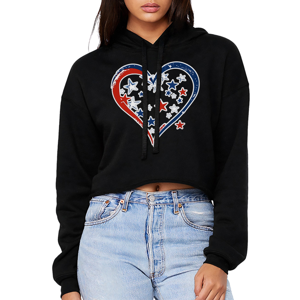 Red White Blue Heart Women’s Cropped Hoodie – USA Flag Hooded Sweatshirt – Cute USA Super Crop Top Hoodies