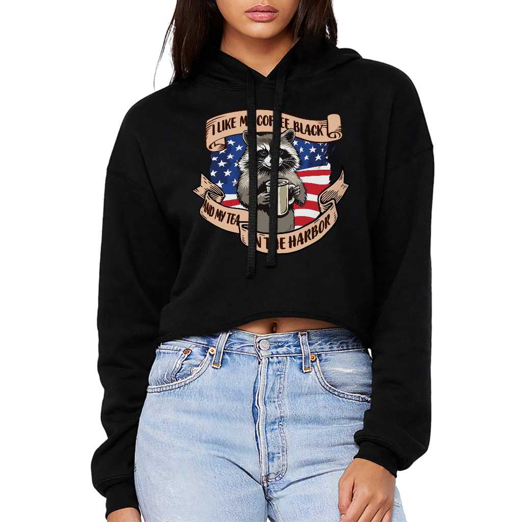 Tea in the Harbor Women’s Cropped Hoodie – Funny Raccoon Hooded Sweatshirt – Cool Quote Super Crop Top Hoodies