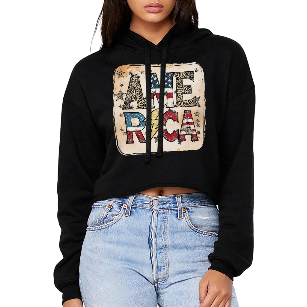 America Graphic Women’s Cropped Hoodie – Retro Design Hooded Sweatshirt – Independence Day Super Crop Top Hoodies
