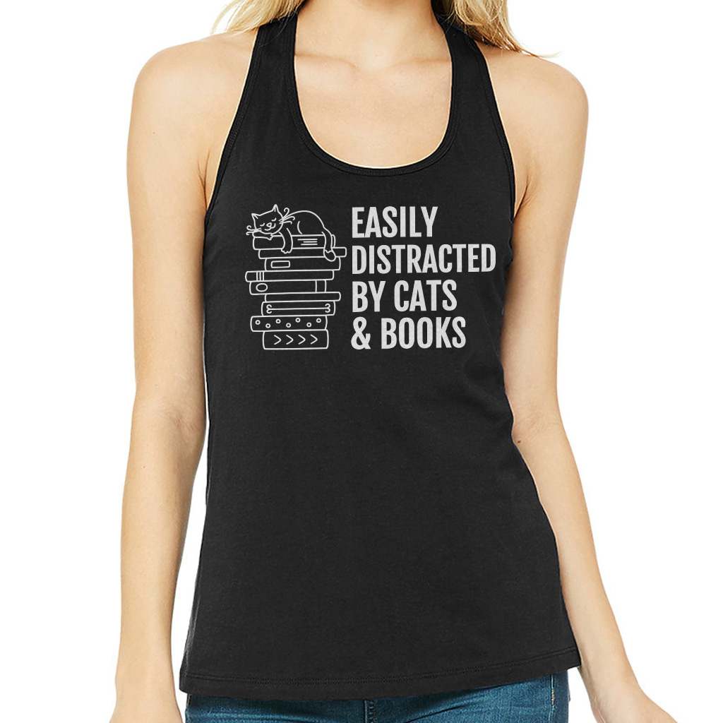 Easily Distracted By Cats And Books Racerback Tank – Cats and Books Tank Top – Book Lover Tank