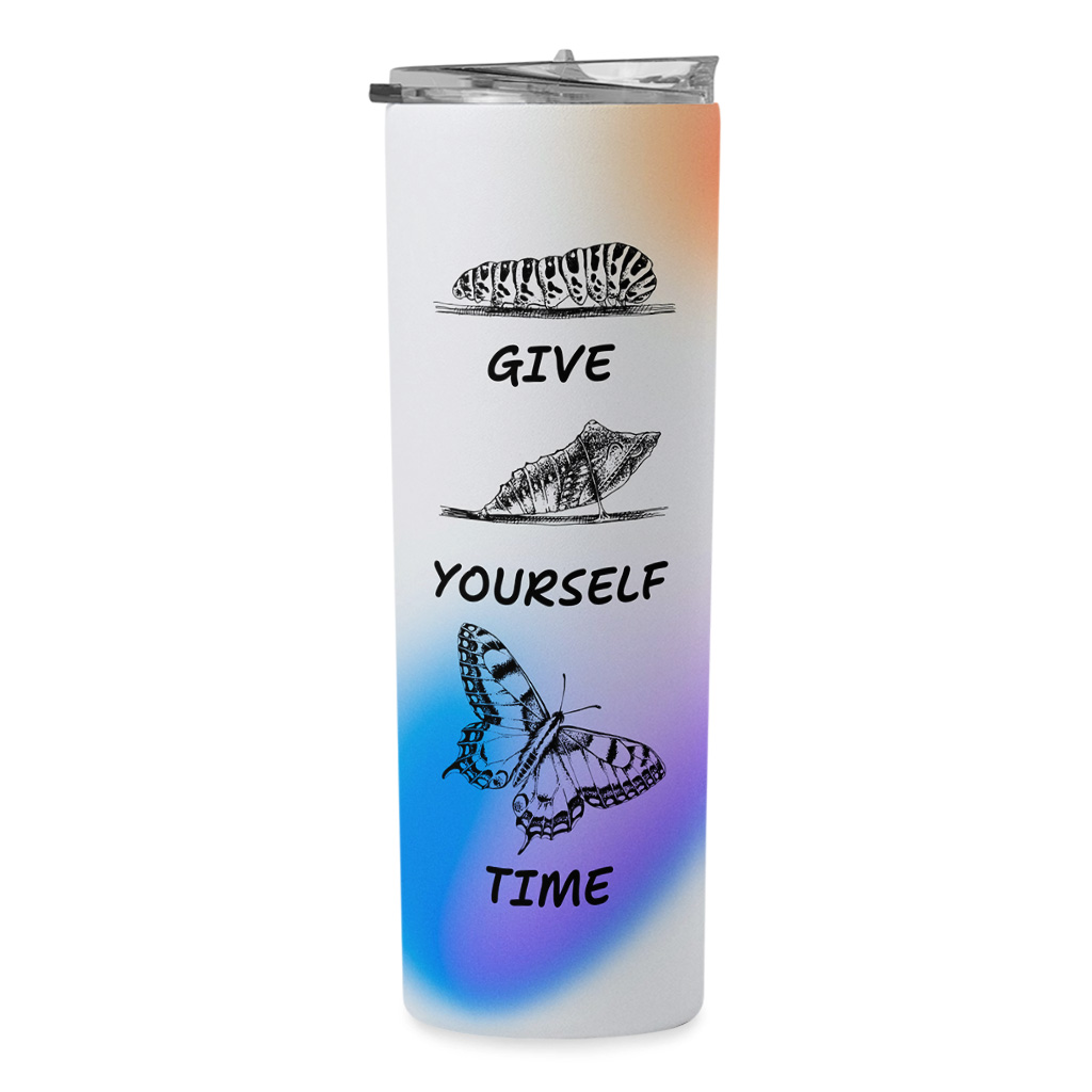 Give Yourself Time 20oz Skinny Tumbler – Self Love Travel Mug – Butterfly Graphic Stainless Steel Tumbler