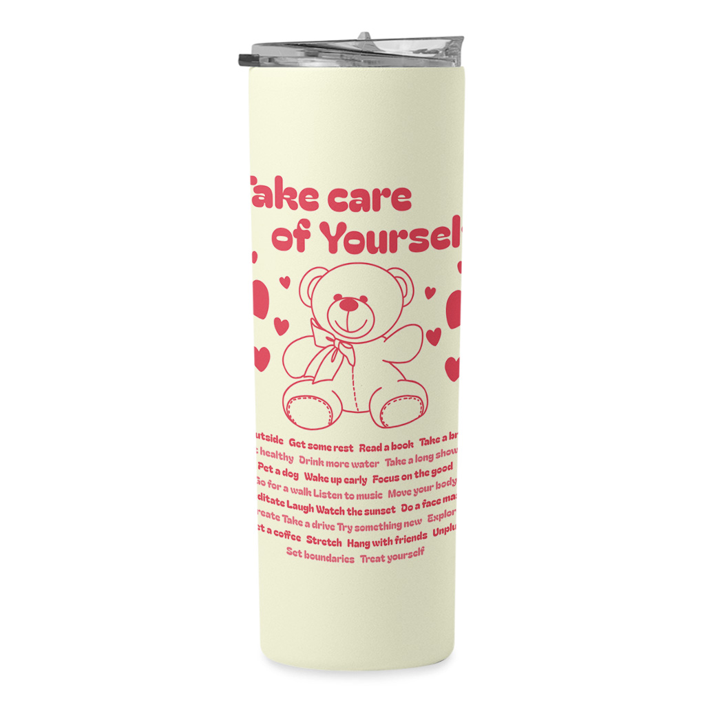 Take Care Of Yourself 20oz Skinny Tumbler – Cute Teddy Bear Travel Mug – Positive Quote Stainless Steel Tumbler