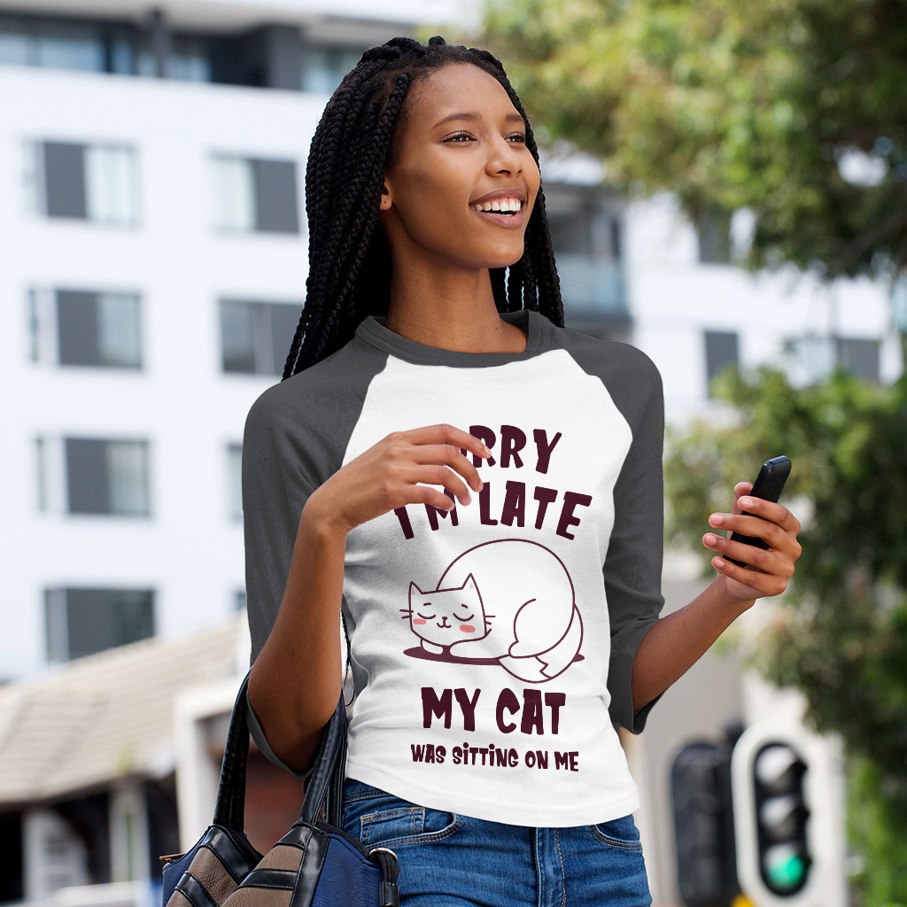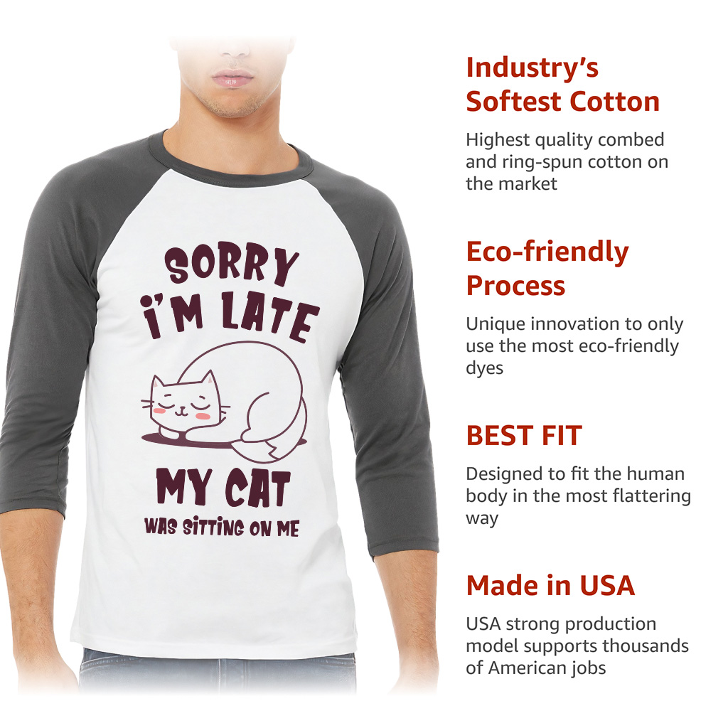 Sorry I’m Late My Cat Was Sitting On Me Baseball T-Shirt is proudly made with 7x less water than average manufacturers, in recycle-friendly facilities that also guarantee zero sweatshop conditions. Funny Graphic 3/4 Sleeve is designed and printed in California.