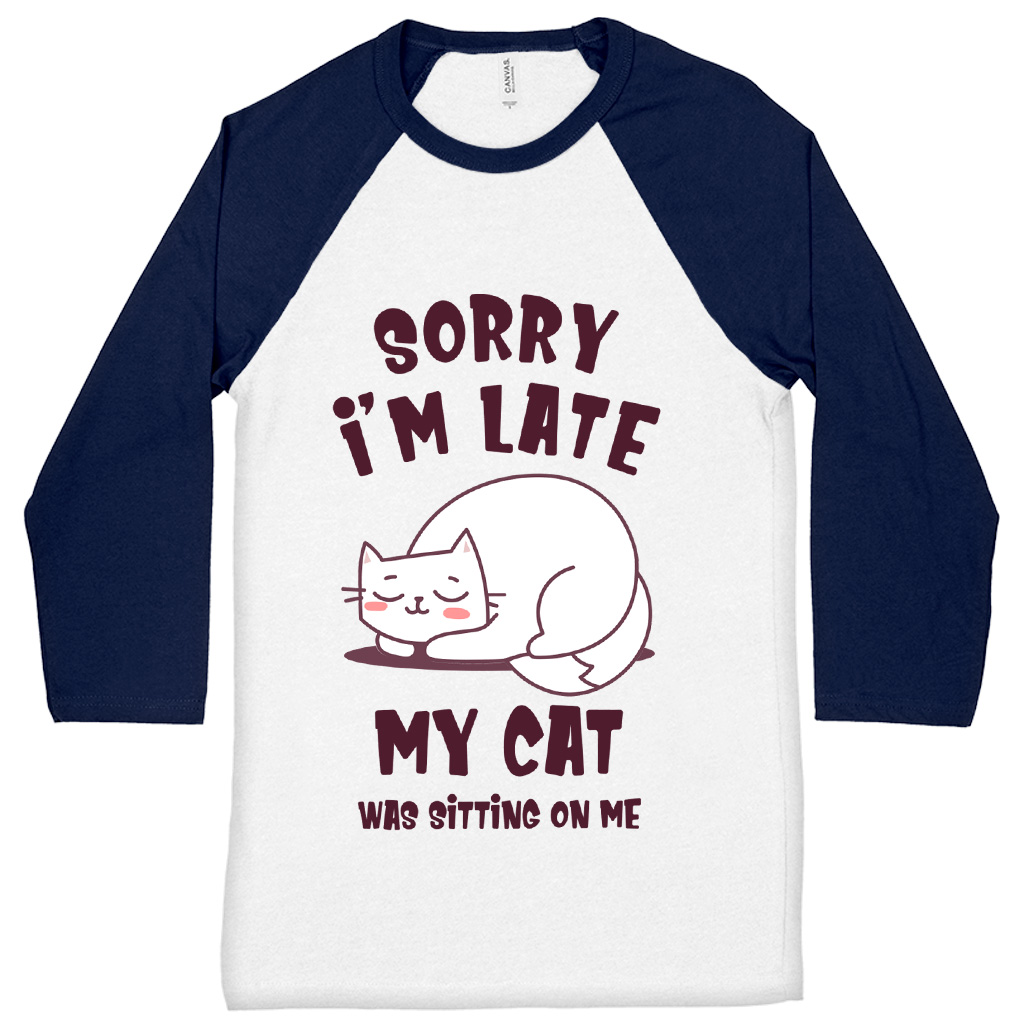 Sorry I’m Late My Cat Was Sitting On Me Baseball T-Shirt is proudly made with 7x less water than average manufacturers, in recycle-friendly facilities that also guarantee zero sweatshop conditions. Funny Graphic 3/4 Sleeve is designed and printed in California.