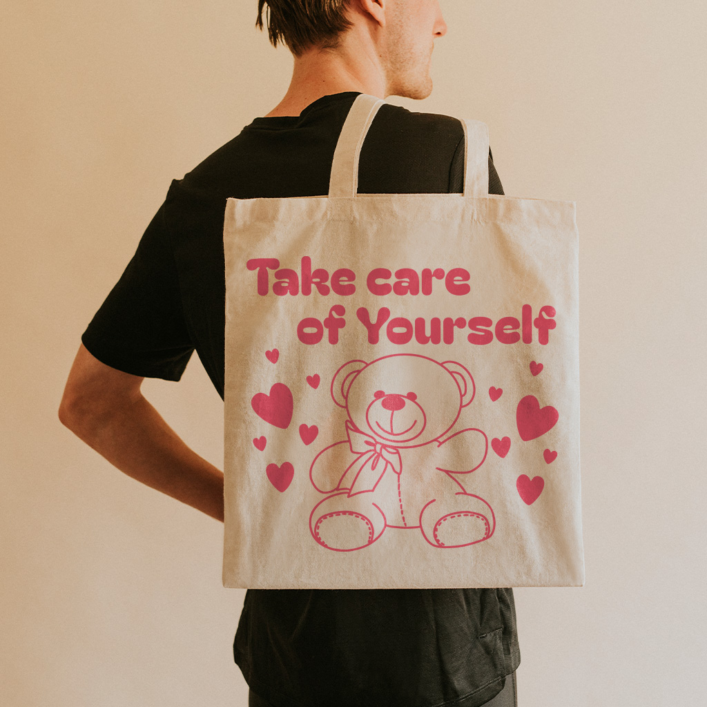 Take Care Of Yourself 100% Cotton Tote Bag – Cute Teddy Bear Grocery Shopping Cloth Bag – Positive Quote Eco-friendly Tote Bag