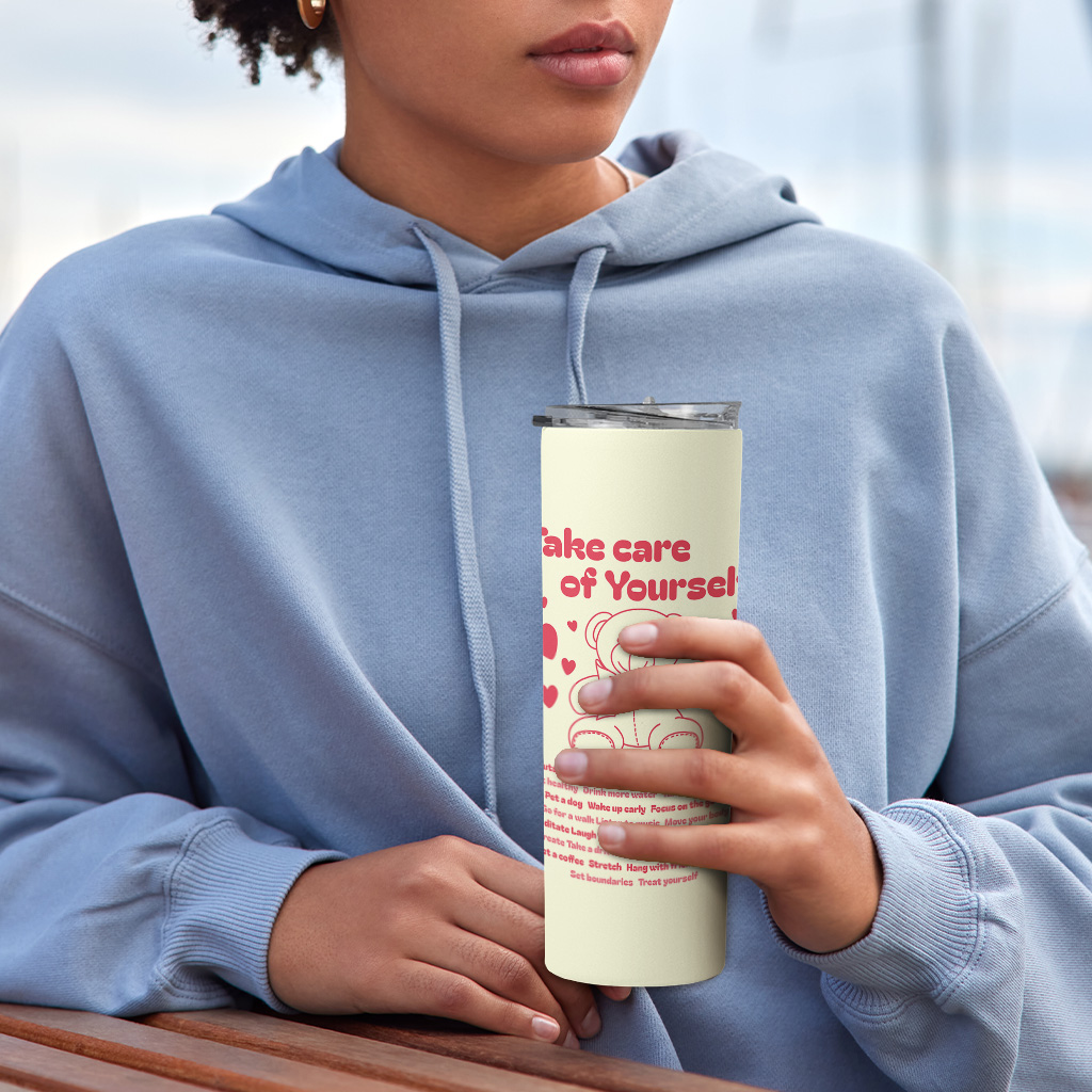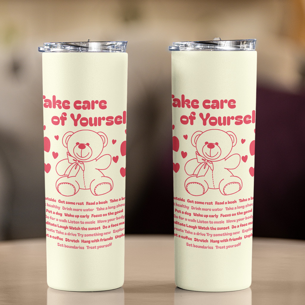 Take Care Of Yourself 20oz Skinny Tumbler – Cute Teddy Bear Travel Mug – Positive Quote Stainless Steel Tumbler