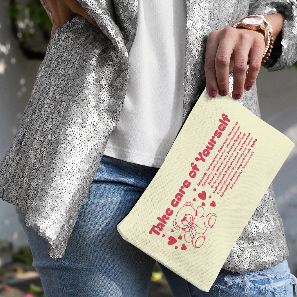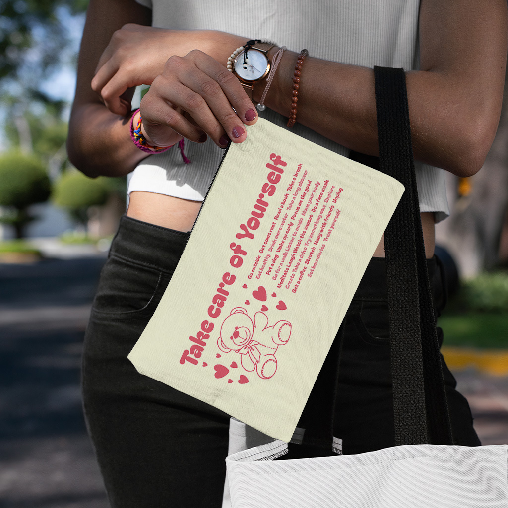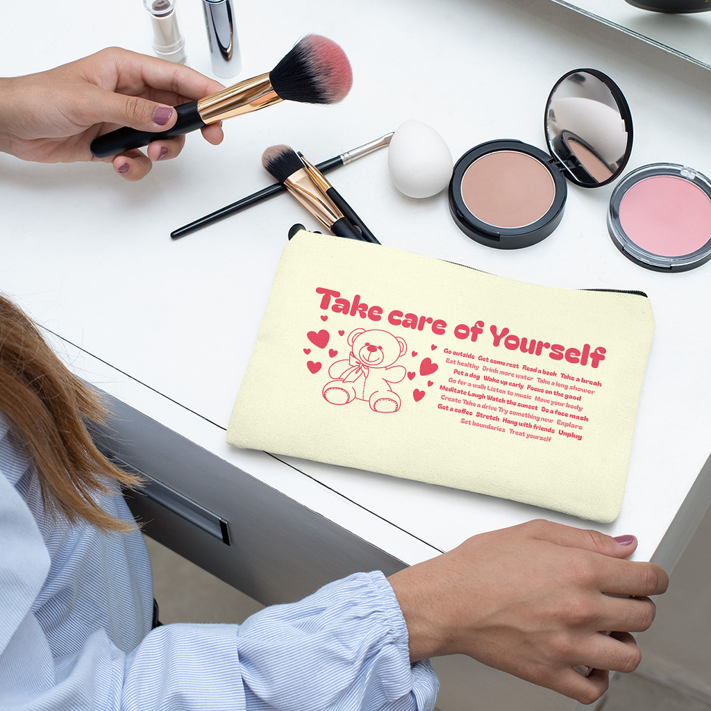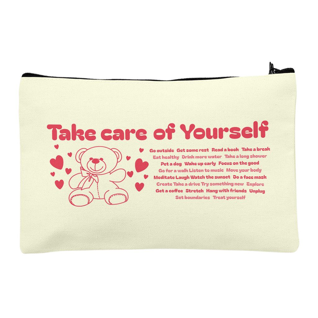 Take Care Of Yourself Travel Makeup Bag Looking for a new makeup bag? Check out our cotton canvas Positive Quote Accessory Pouch! This bag is perfect for storing all your makeup essentials. The gold color zipper adds a touch of style, while the spacious interior provides plenty of room for everything…