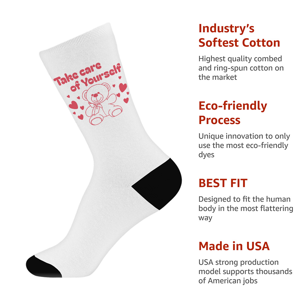 Take Care Of Yourself Unisex Socks Looking for a way to add some personality to your everyday style? Check out Cute Teddy Bear Crew Socks! With a ribbed tube and cushioned bottoms, our socks are sure to make a statement. Plus, they’re super comfortable, so you can wear them all…