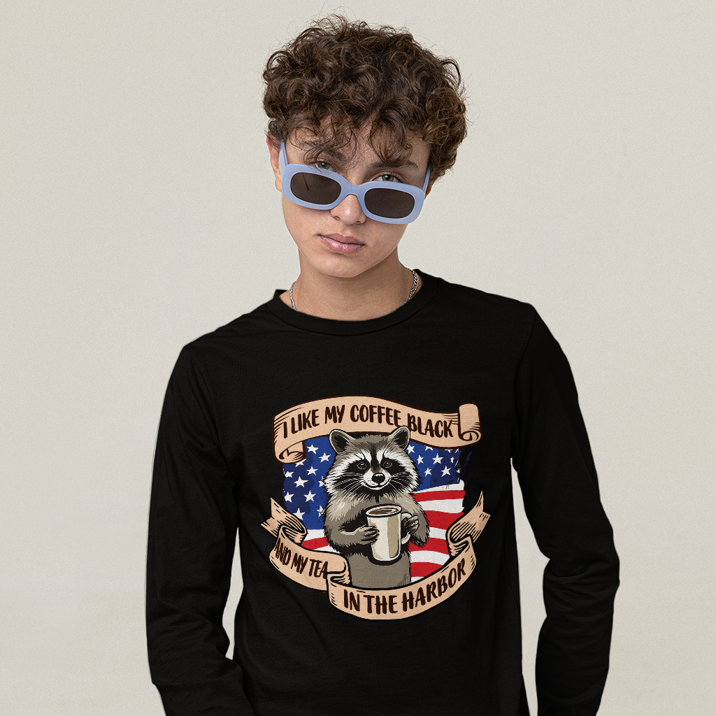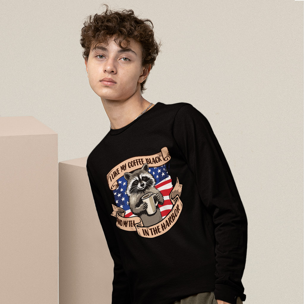 Tea in the Harbor Long Sleeve T-Shirt is proudly made with 7x less water than average manufacturers, in recycle-friendly facilities that also guarantee zero sweatshop conditions. Funny Raccoon T-Shirt is designed and printed in California.