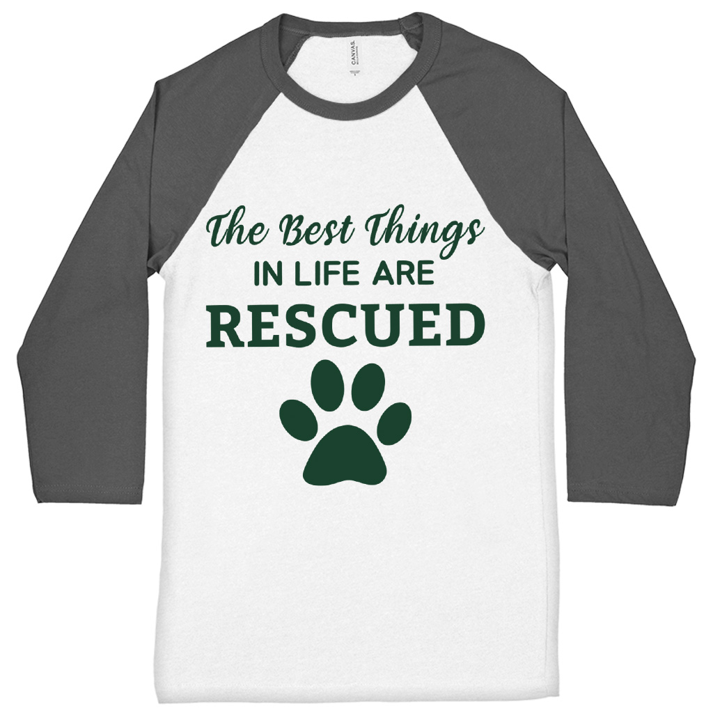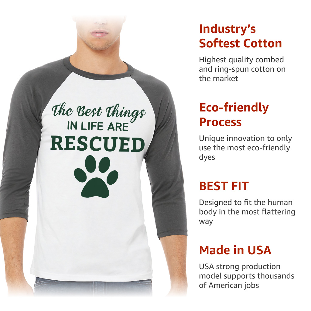 The Best Things in Life Are Rescued Baseball T-Shirt is proudly made with 7x less water than average manufacturers, in recycle-friendly facilities that also guarantee zero sweatshop conditions. Rescue Dog 3/4 Sleeve is designed and printed in California.
