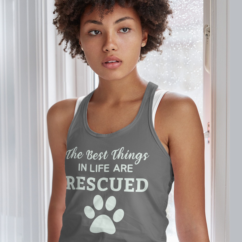 The Best Things in Life Are Rescued Racerback Tank is no ordinary piece of clothing. Its side-seamed detail and flatlock-finished hems provide a retail fit for clothing that’s true to size.