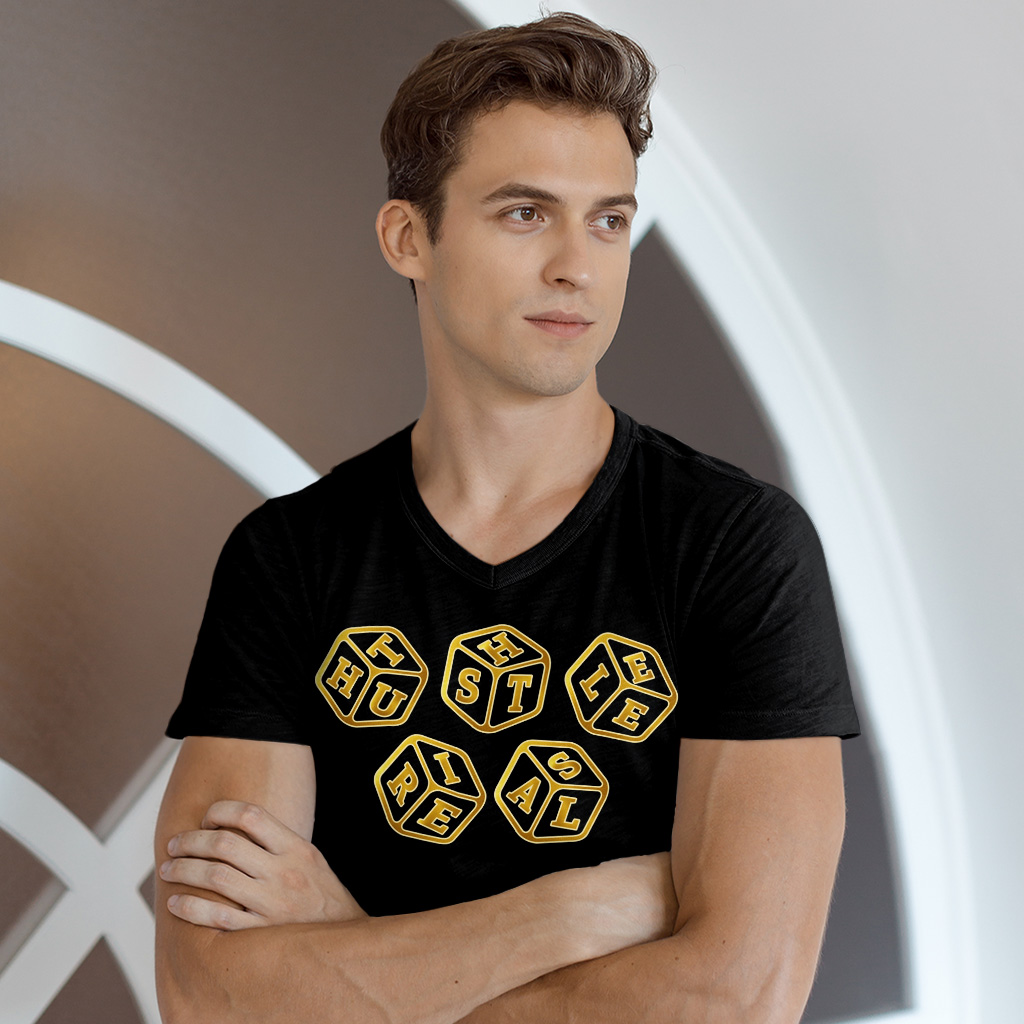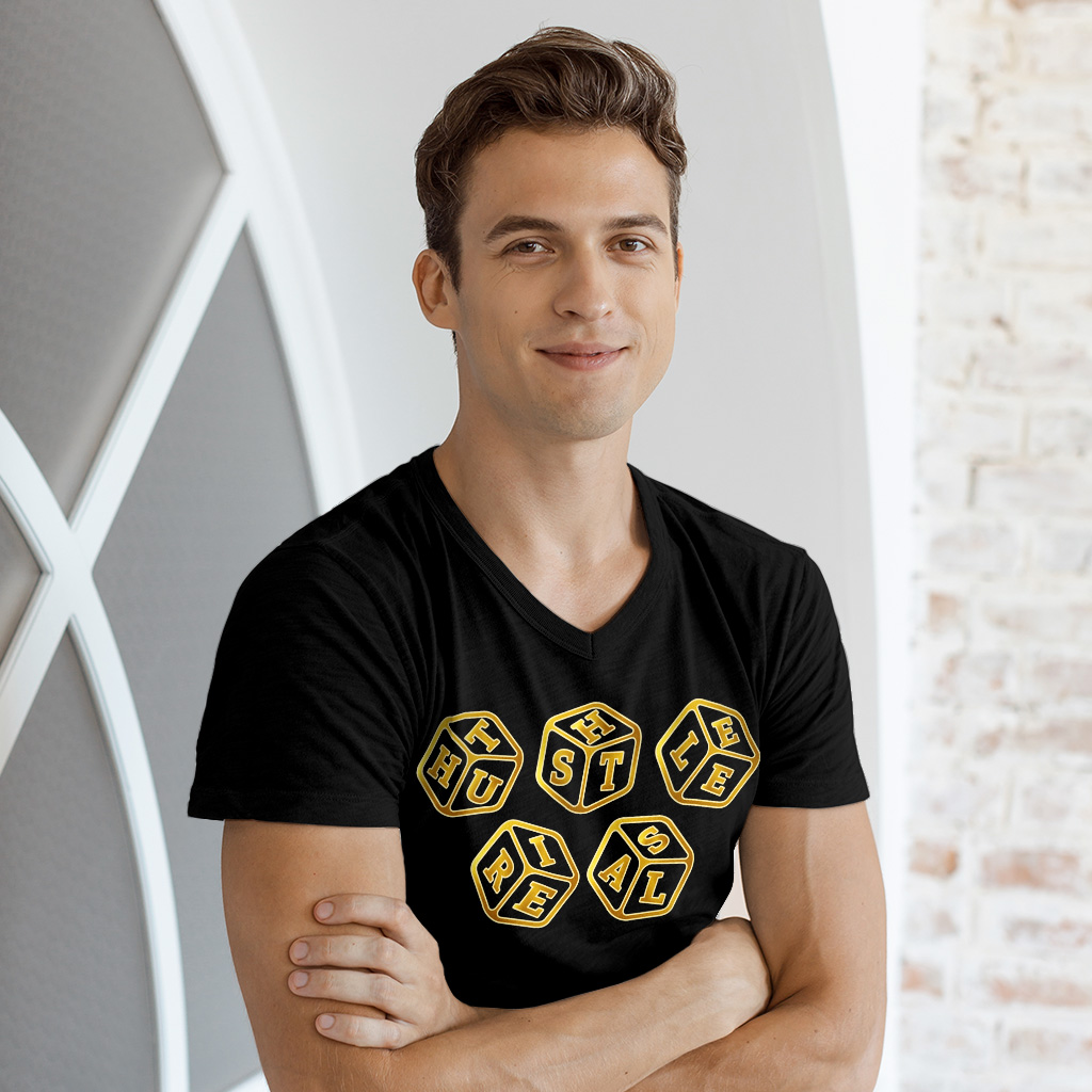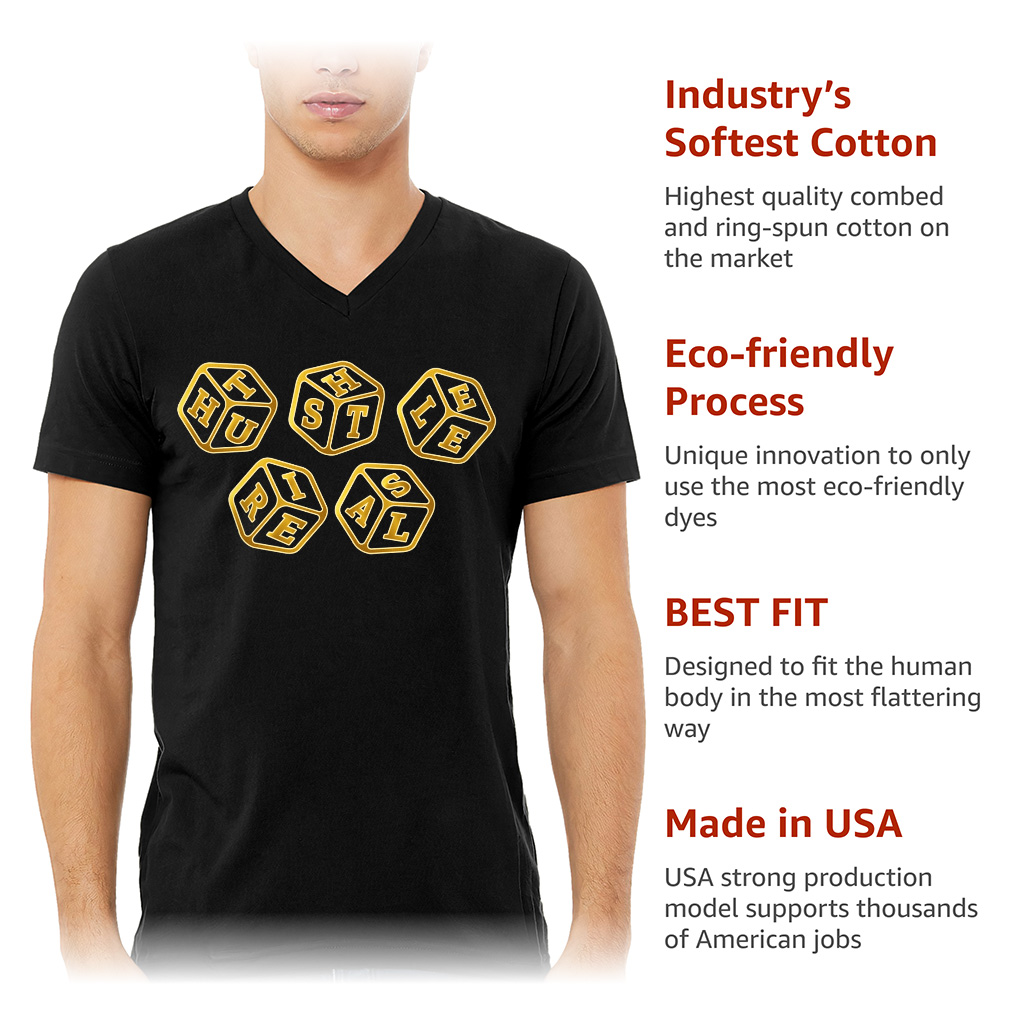 The Hustle Is Real V-Neck T-Shirt is proudly made with 7x less water than average manufacturers, in recycle-friendly facilities that also guarantee zero sweatshop conditions