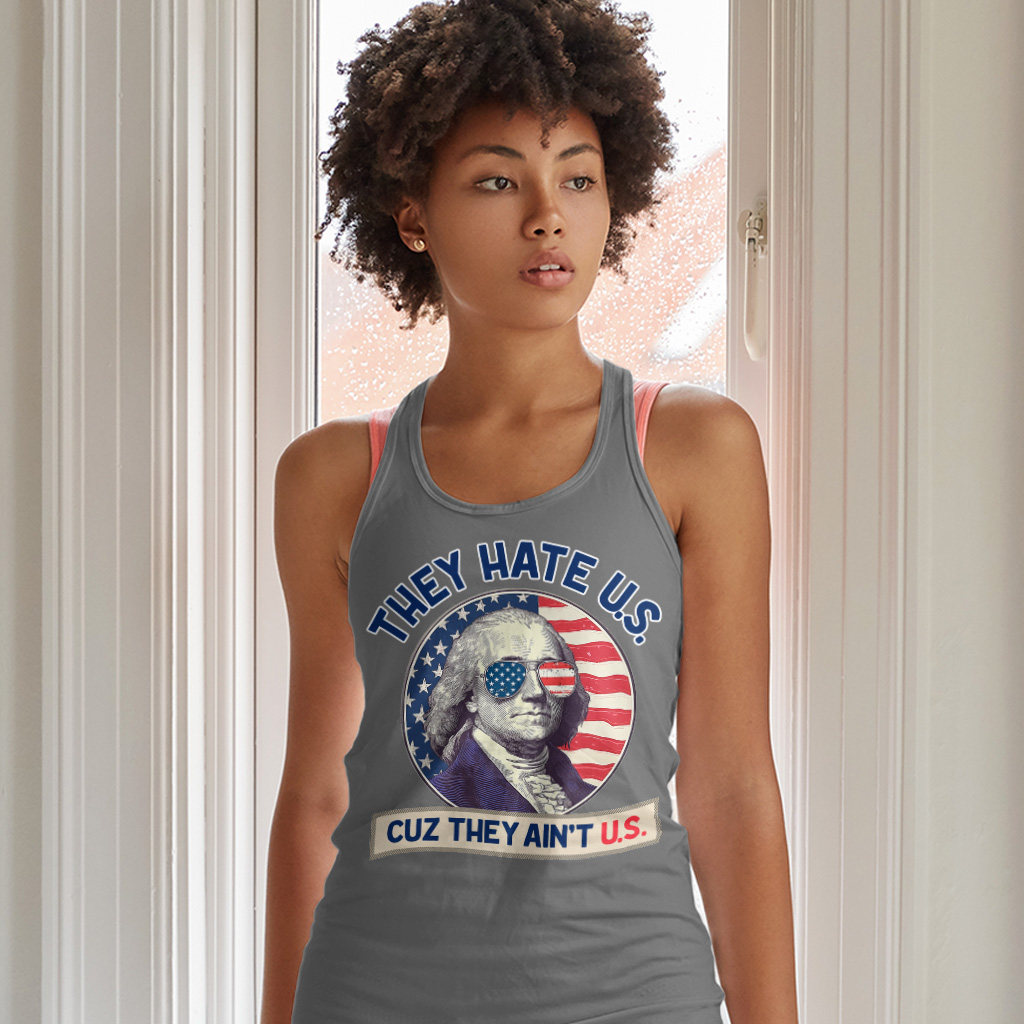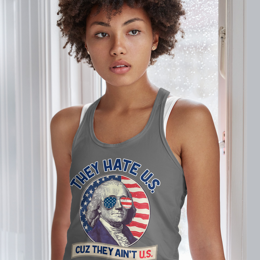 They Hate Us Cuz They Ain’t Us Racerback Tank is no ordinary piece of clothing. Its side-seamed detail and flatlock-finished hems provide a retail fit for clothing that’s true to size.
