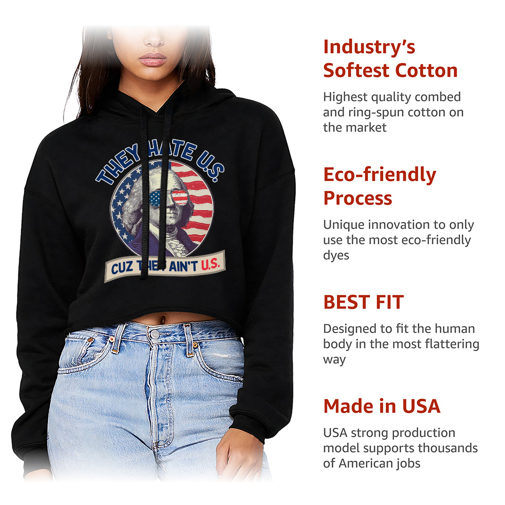 They Hate Us Cuz They Ain’t Us Women’s Cropped Hoodie is proudly made with 7x less water than average manufacturers, in recycle-friendly facilities that also guarantee zero sweatshop conditions. Patriotic Celebration Women’s Cropped Hoodie is designed and printed in California.