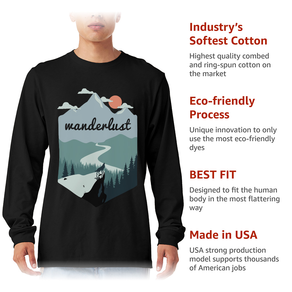 Wanderlust Long Sleeve T-Shirt is proudly made with 7x less water than average manufacturers, in recycle-friendly facilities that also guarantee zero sweatshop conditions. Outdoorsy T-Shirt is designed and printed in California.