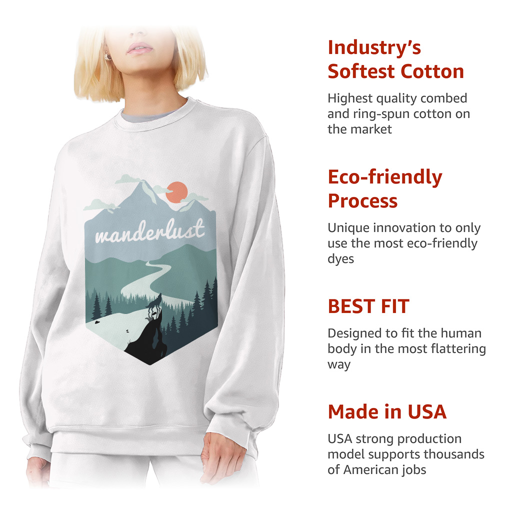 Wanderlust Sweatshirt is made from a 50% U.S. Cotton/50% Polyester blend, this warm 8.0 oz sq/yd classic fit style looks great and makes a great canvas for decorating. Wanderlust Sweatshirt is designed and printed in California.