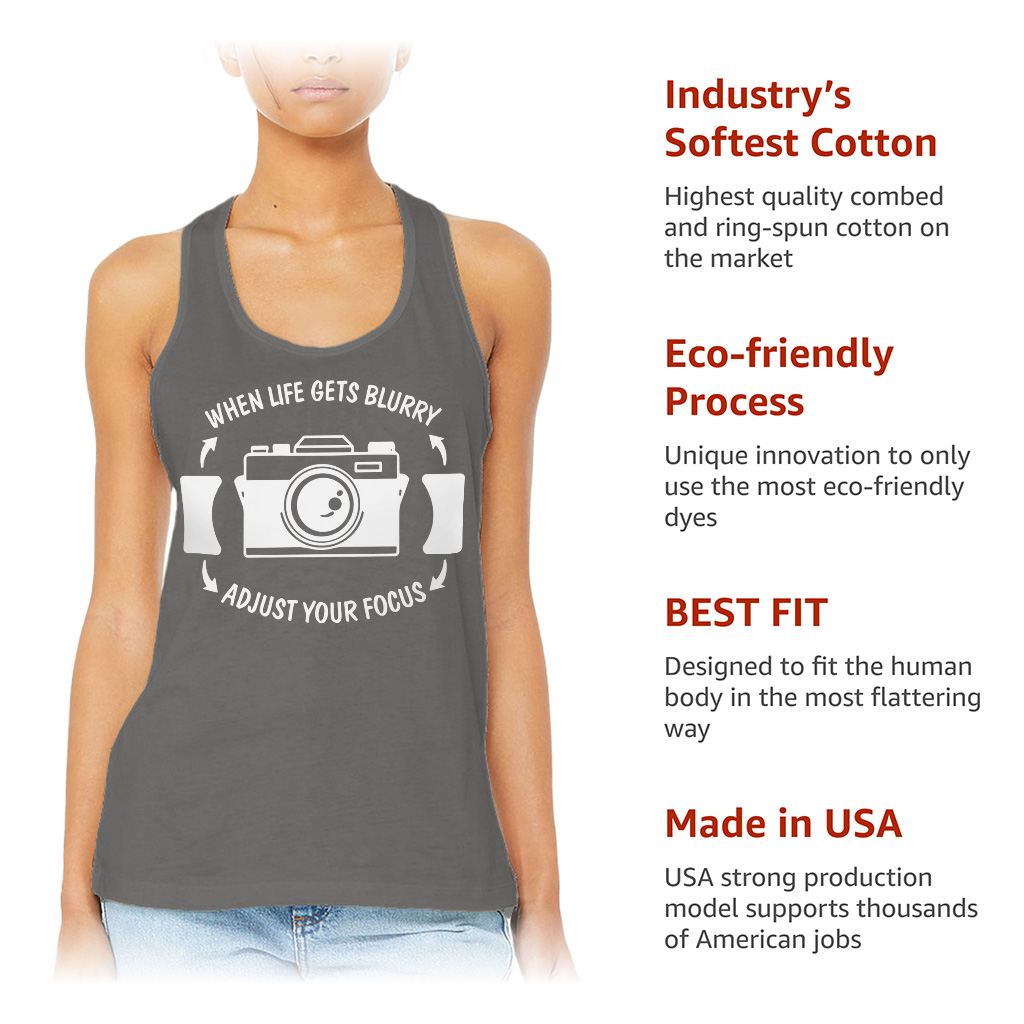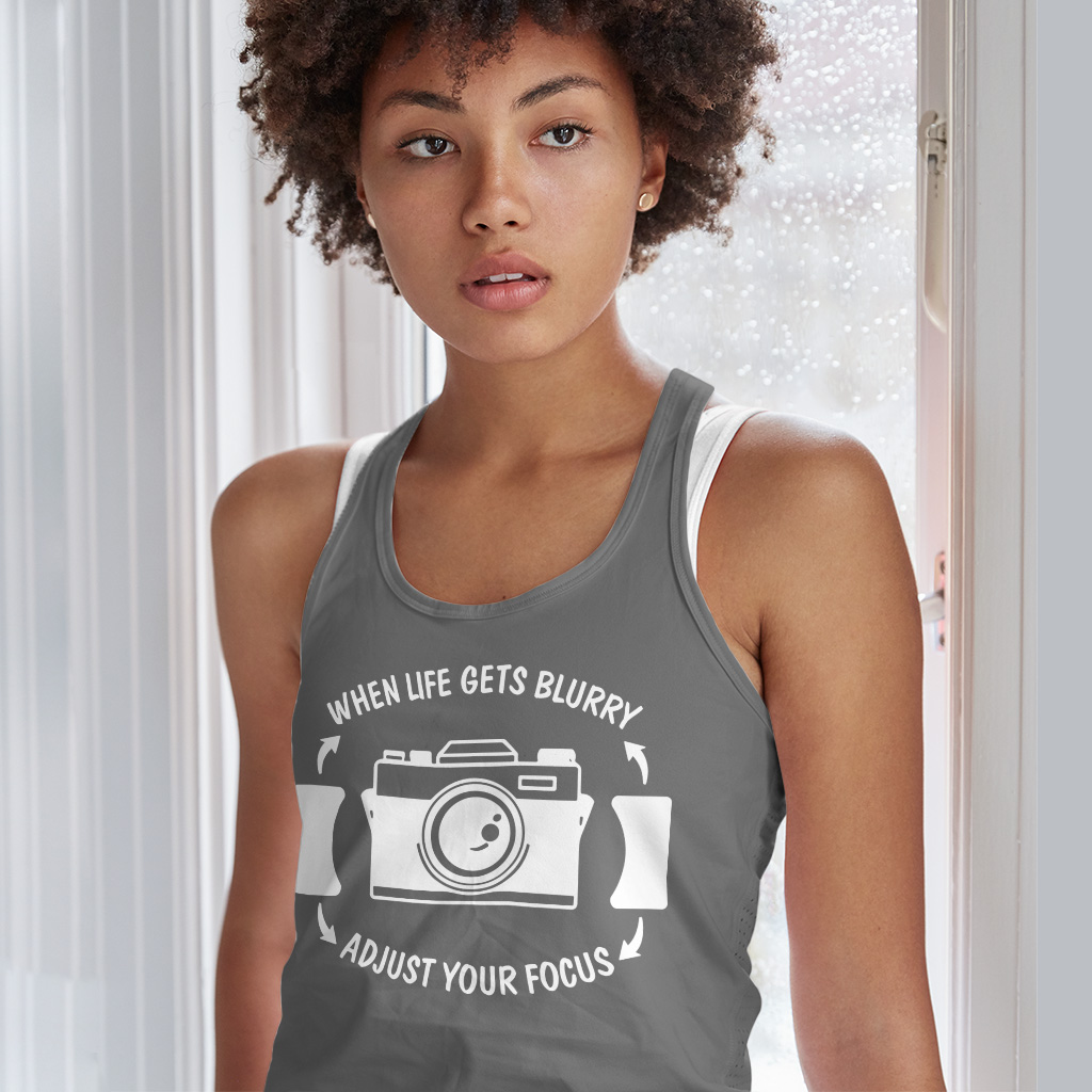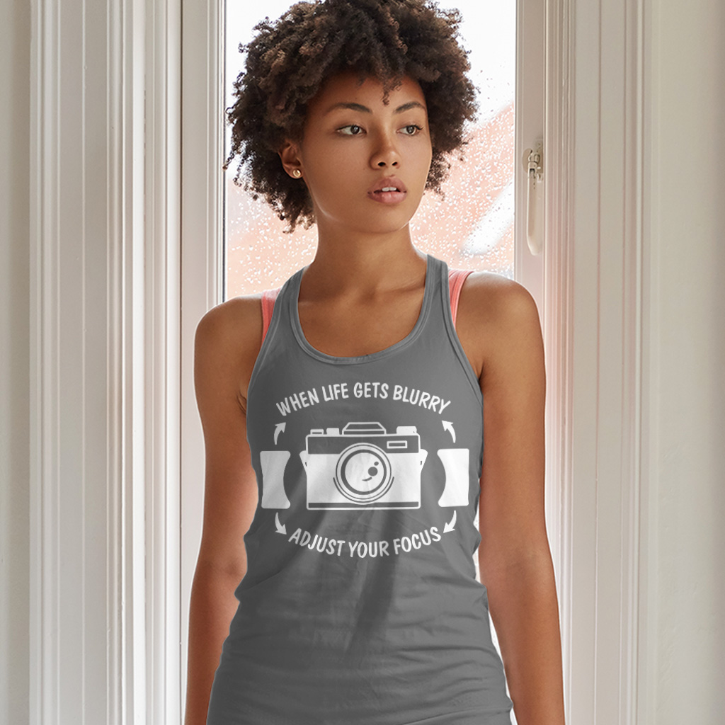 When Life Gets Blurry Adjust Your Focus Racerback Tank is no ordinary piece of clothing. Its side-seamed detail and flatlock-finished hems provide a retail fit for clothing that’s true to size.